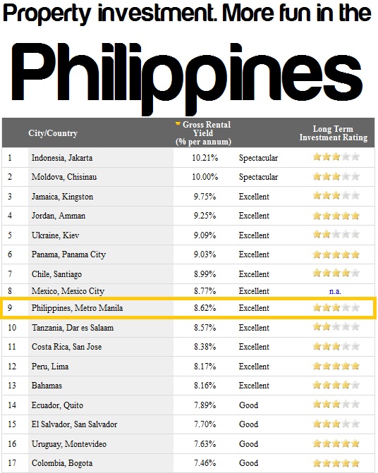 What does the above table tell us? It simply means that, compared globally, we have an excellent rating. And if you’ll invest your money in a Philippines property, you’ll get a gross rental yield of 8.62% annually. Isn’t that something amusing? And did I mention that the said rating was global? And Philippines is in the Top 10? Aren’t you enjoying that fact? Well, I will understand if you’re not a Filipino, and you didn’t feel any form of enjoyment or at least a sense of pride, knowing it. But from an investor’s point of view, these are the figures that you’ll consider and want to enjoy. Am I making sense here? I mean, if Merriam-Webster defines “fun” as what provides amusement or enjoyment. Then, if we put ourselves, in an investor’s shoes, what provides a more fun experience to an investor, are those instruments that gives a positive yield or return. And Philippines, when it comes to property investment, offers that kind of fun.