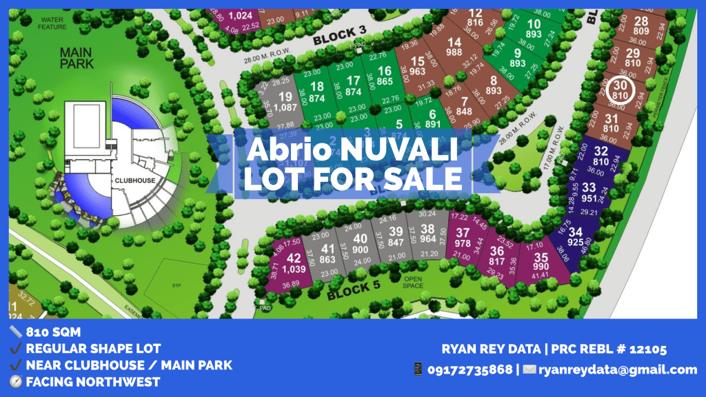 Abrio NUVALI LOT FOR SALE Phase 1 Block 5 Lot 30 PROPERTY INFORMATION Regular Shape Lot Near Clubhouse / Main Park Property Name: Abrio NUVALI Property Type: Lot Phase: 1 Block: 5 Lot: 30 Lot Area: 810 sqm Price: β± 38,880,000 Abrio NUVALI LOT FOR SALE Phase 1 Block 5 Lot 30 INQUIRE HERE HOME